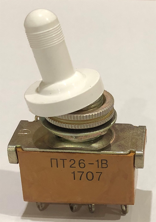 Тумблер ПТ26-2В перекидной четырёхполюсный переключатель с двухпозиционной фиксацией ручки управления.