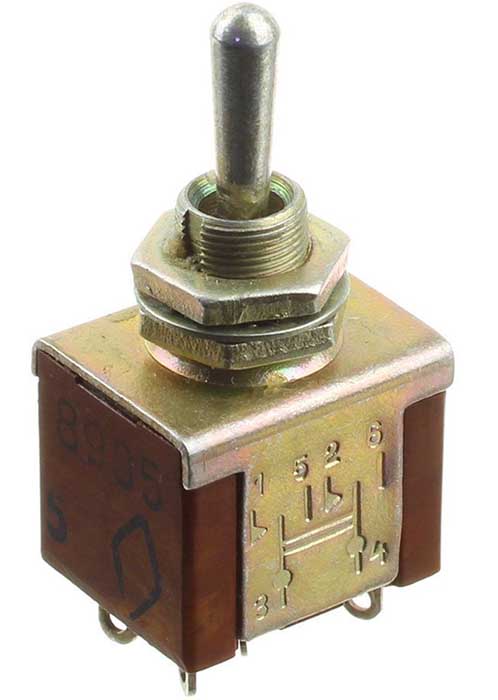 Тумблер ПТ6-8В перекидной двухполюсный переключатель без протектора с фиксацией ручки управления только в среднем положении.